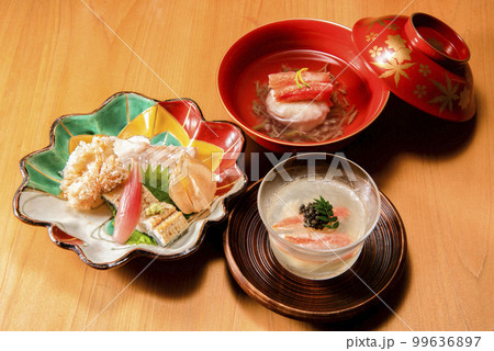 揚げ物や汁物に至るまで、伝統的な和食の技法を用い、季節の素材の味を最大限に引き出します。ご飯と汁物は、心地よいほどのふんわりとした香りと優しい味わいが特徴です。